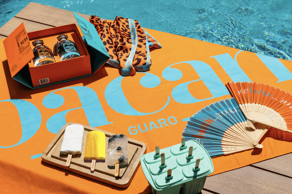 A promotional poster for Bacan Guaro featuring an orange and white design. The main message emphasizes the connection between friends and the drink with the phrase: "This chisme stays between us. You, me, & Bacan