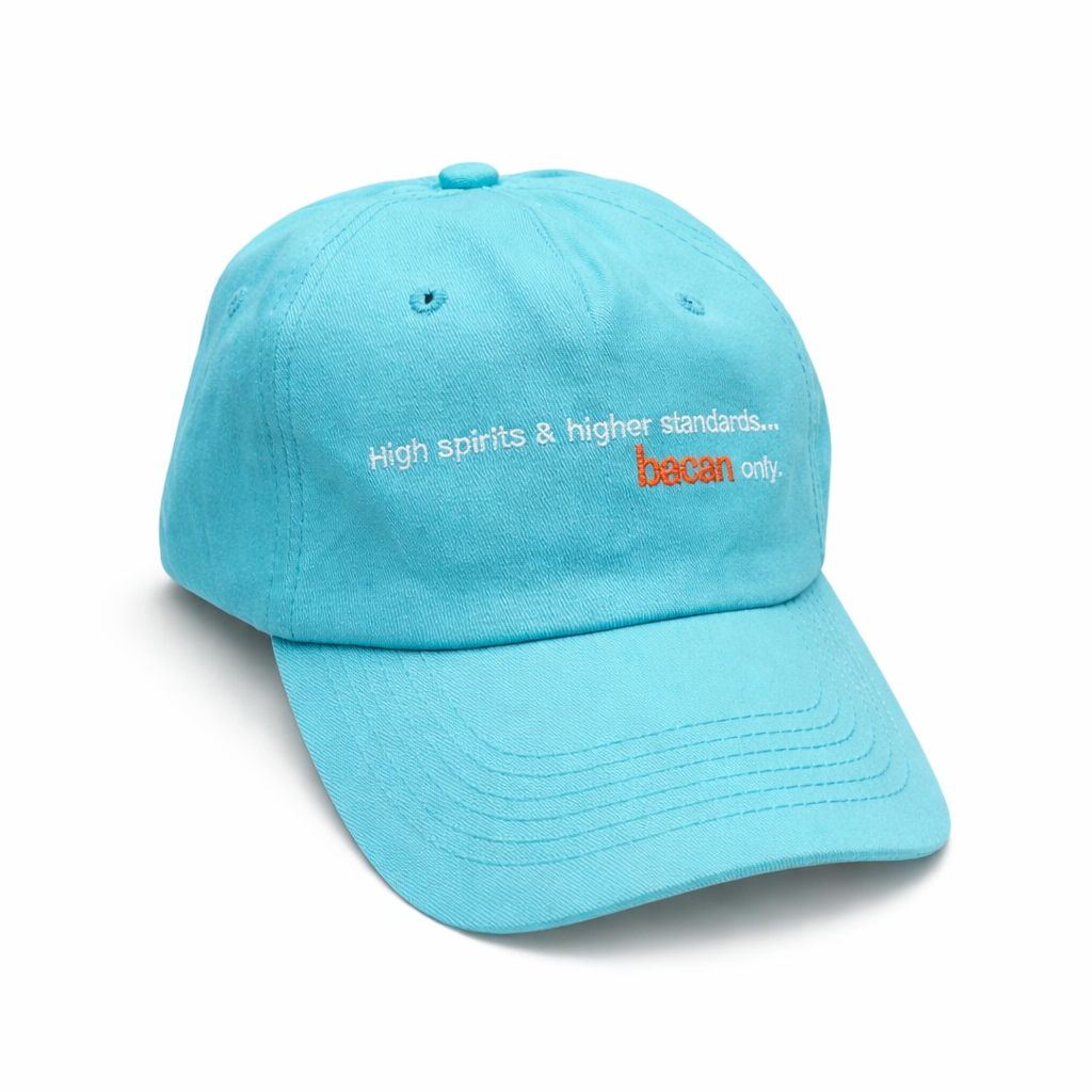 Cotton baseball cap in Bacan turquoise with embroidered Bacan slogan. Adjustable fit. Lightweight, breathable, and made for daily wear