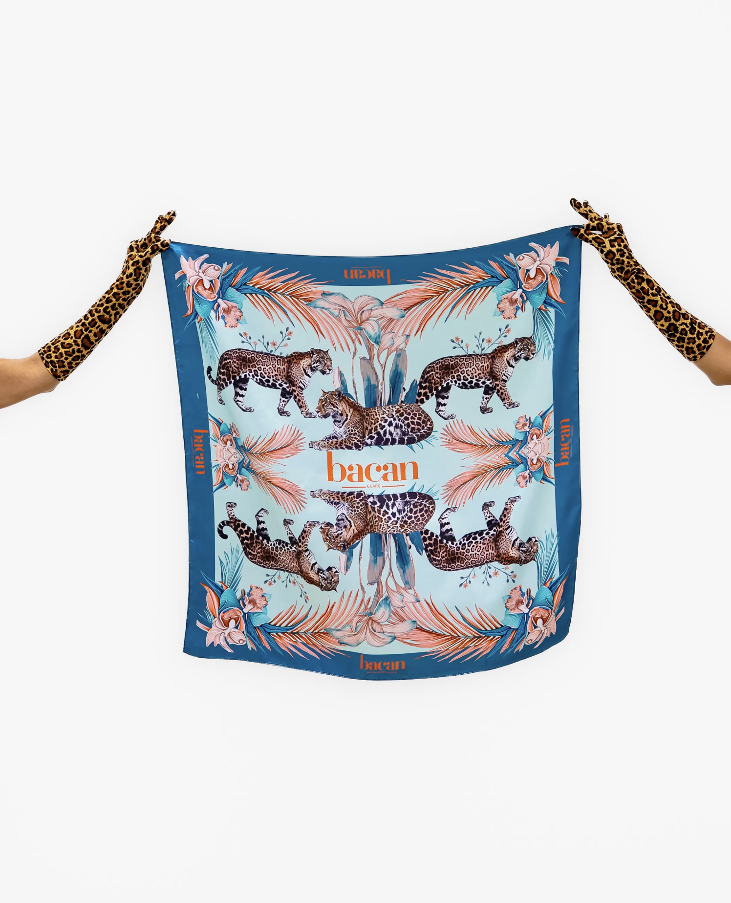 The Bacan Scarf is a versatile accessory that adds a pop of color and style to any outfit. Featuring our custom Bacan design in cool blue, this classic bandana can be worn as a headband, neckerchief, bag accent, or however you express your style.
