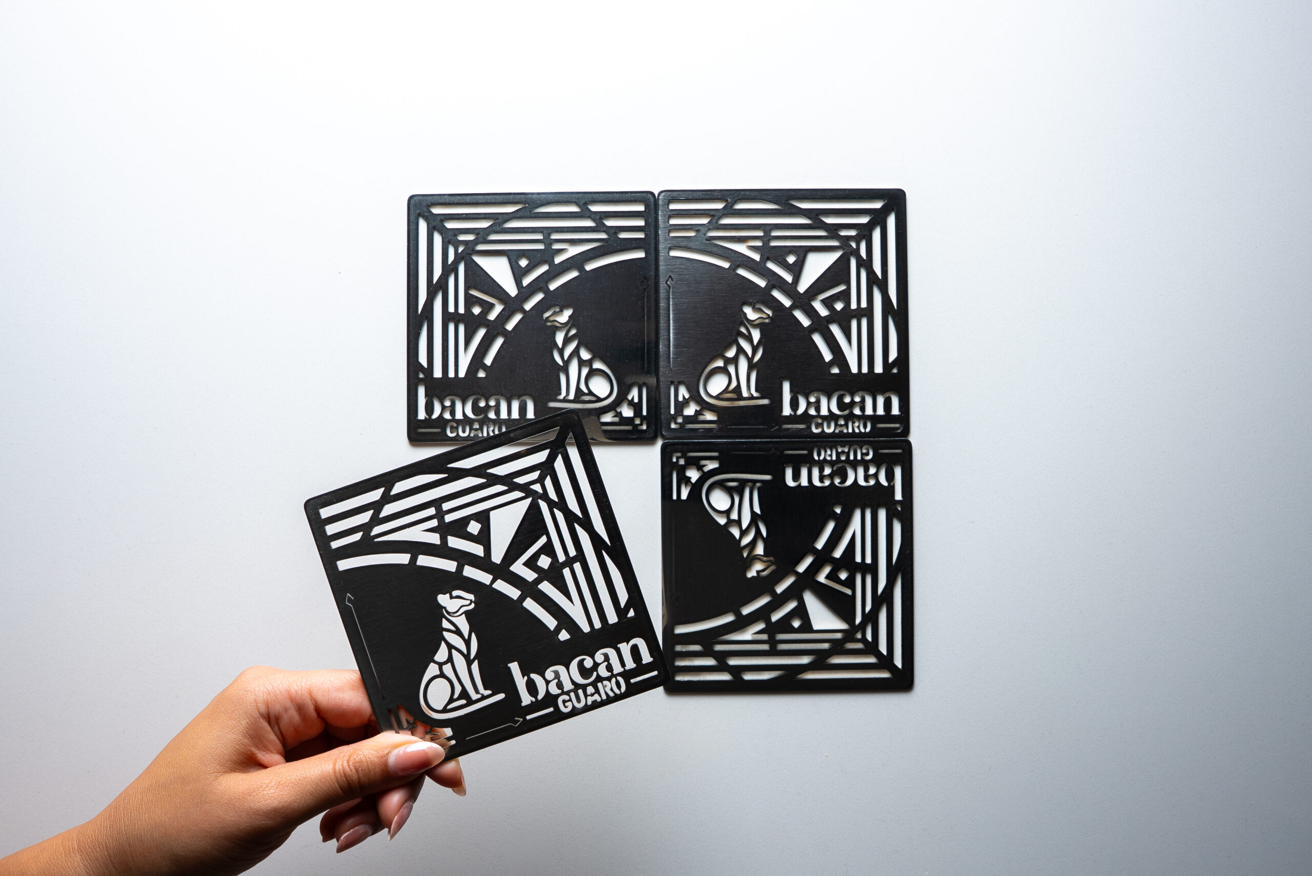 Premium metal coaster set featuring Bacan Guaro’s iconic jaguar and tribal design. Durable and modern, perfect for elevating any bar or tabletop.